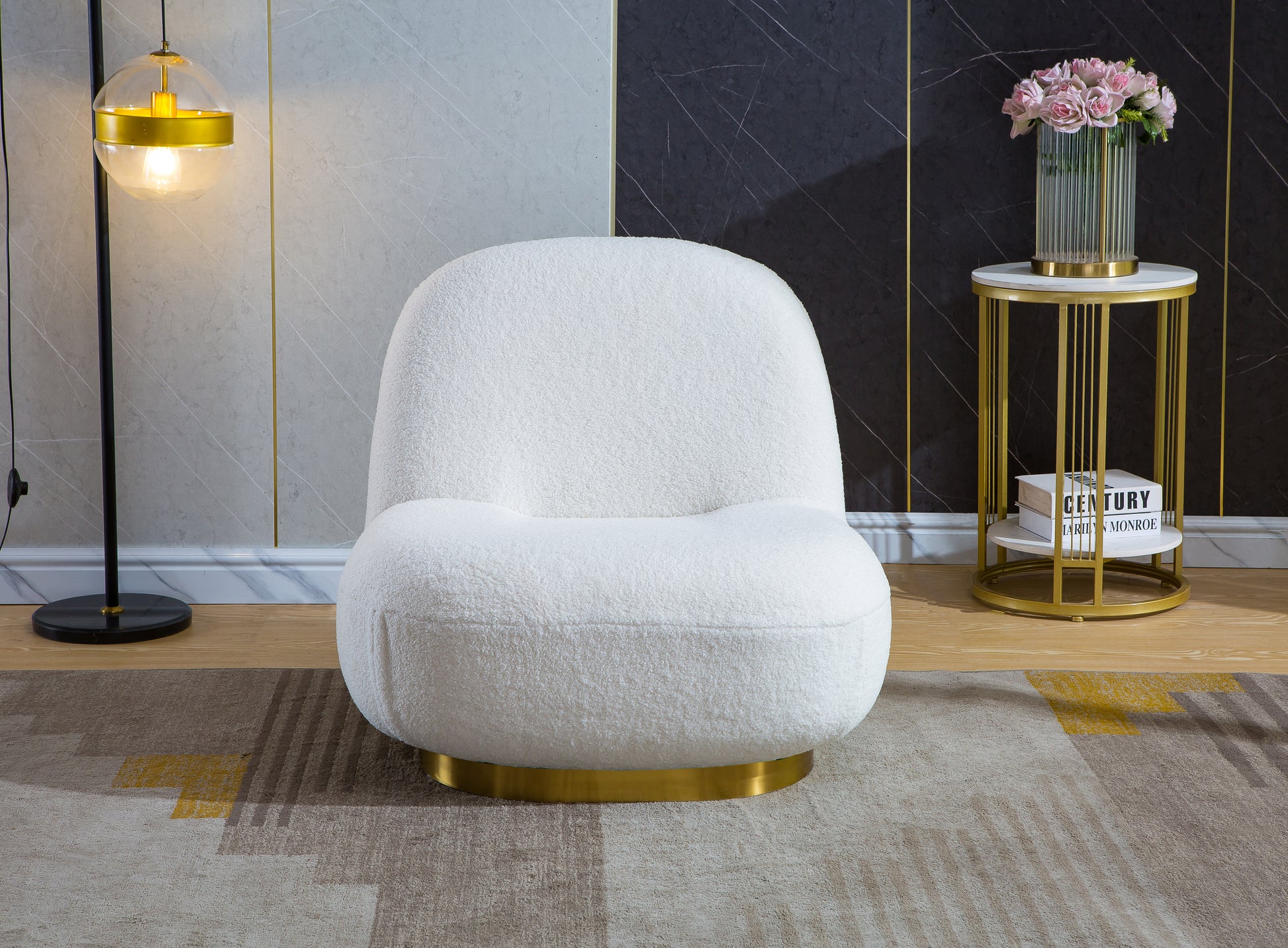 Elevate your living space with this stunning Swivel Barrel Chair, designed for both luxury and comfort. Upholstered in soft Boucle, this chair offers a sleek and contemporary design that complements various décor styles. Its smooth swivel feature ensures easy movement, making it perfect for entertaining or relaxing. Filled with high-density foam, it provides exceptional comfort and support. The gold stainless steel base adds an elegant touch, making it a standout piece for your living room, bedroom, or office. With no assembly required, enjoy this chic chair immediately after unboxing.