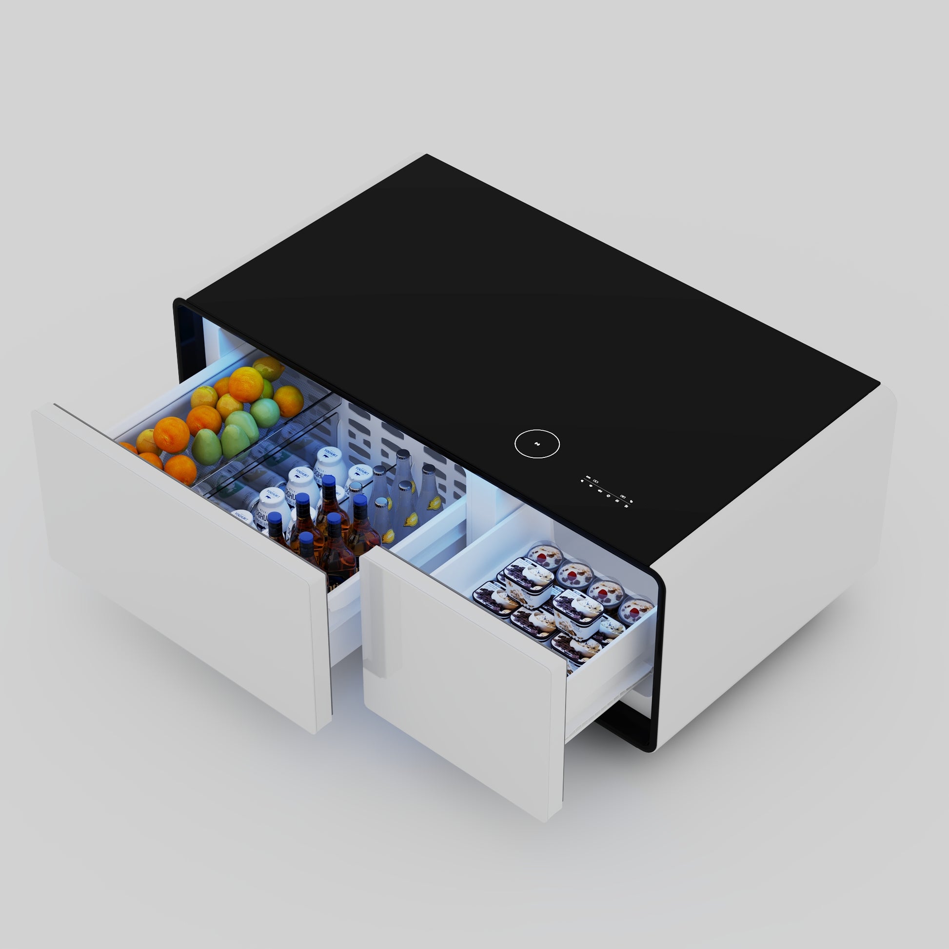 Elevate your living space with the innovative Coffee Table with Two Fridge Drawers for Cooling. This table blends style and functionality, offering cooling and freezing drawers, wireless charging, and power outlets. Models CTA001-006 & CT5011 feature a Bluetooth speaker and atmospheric lamp, while CT5012/5013 include cooling/freezing drawers but lack a speaker. All versions come with a sliding storage box and, for select models CT5011-13 has wheels for easy mobility. Experience seamless control with either a touchscreen or mechanical knobs.