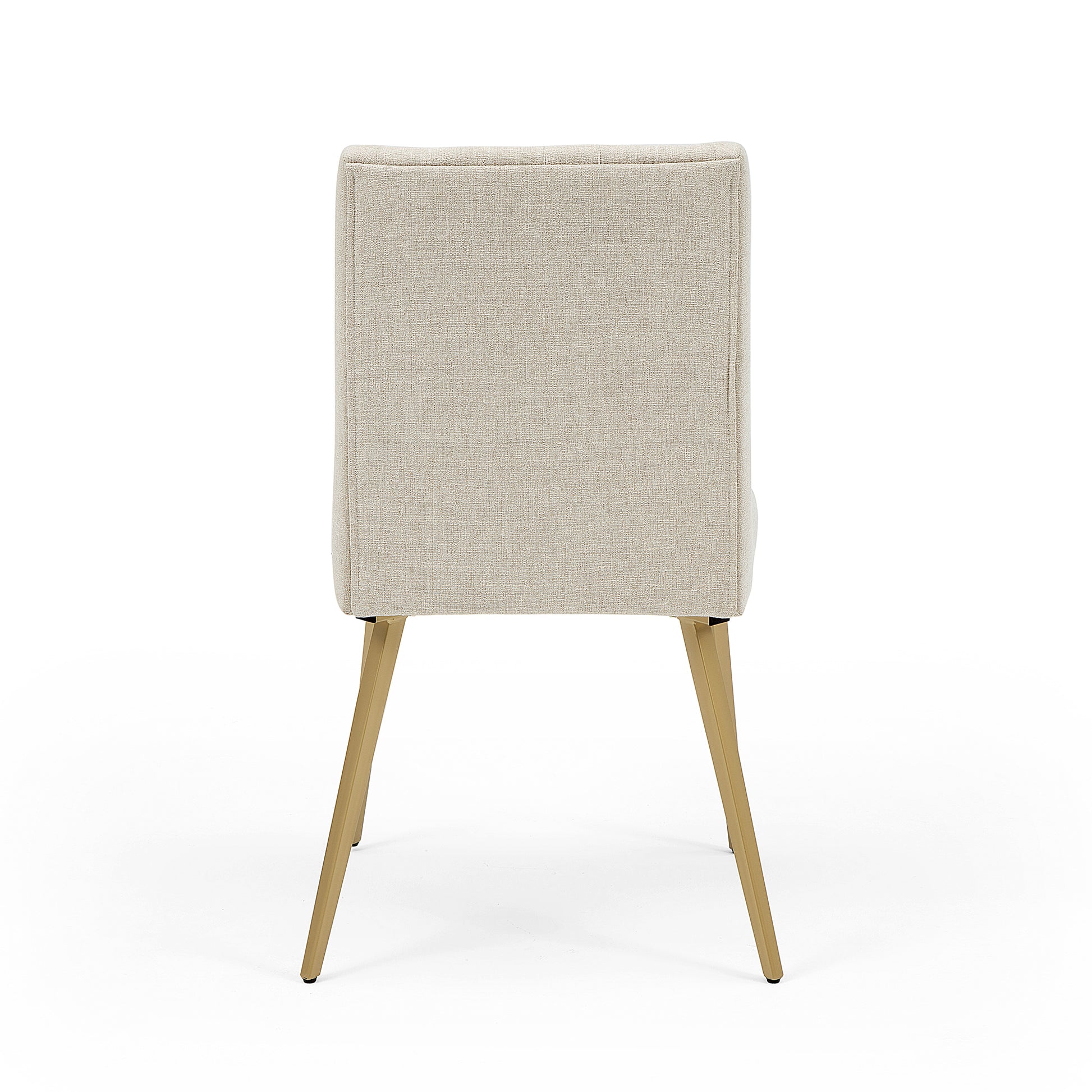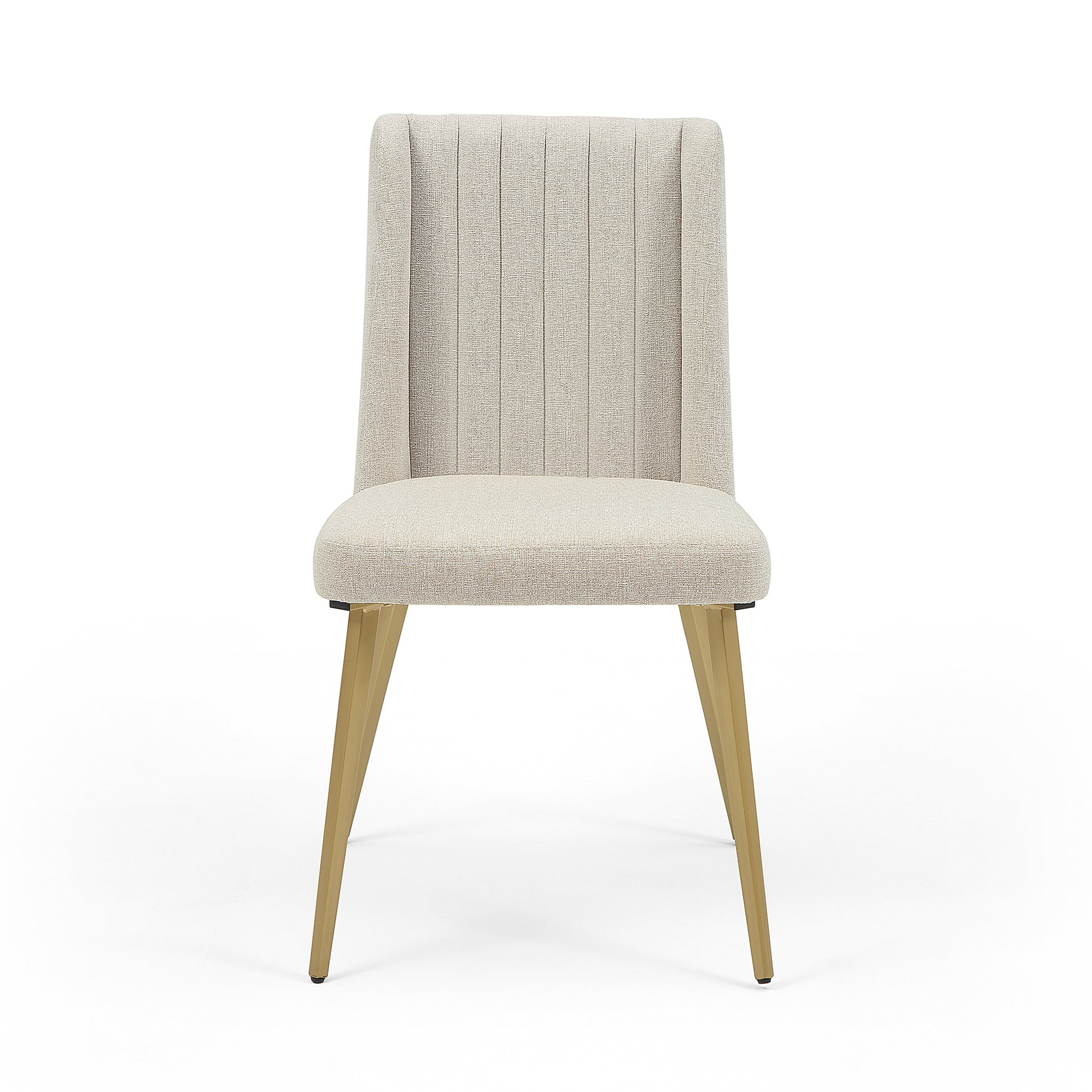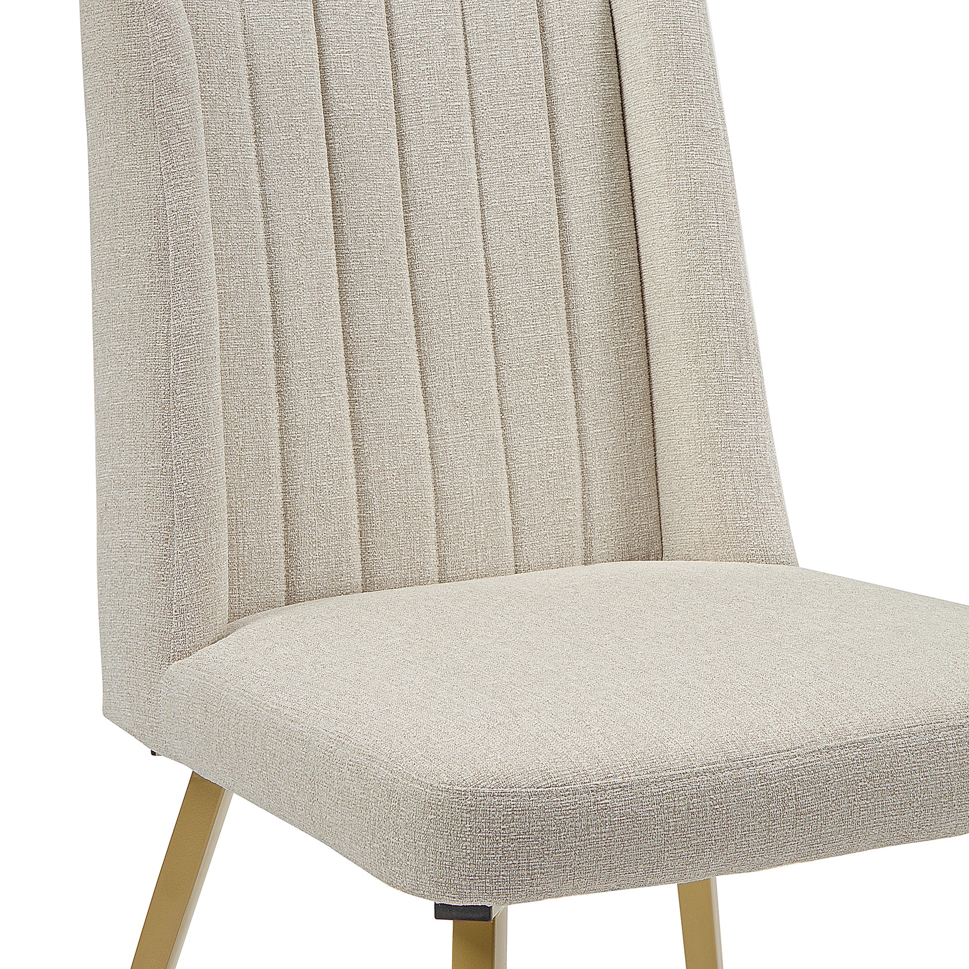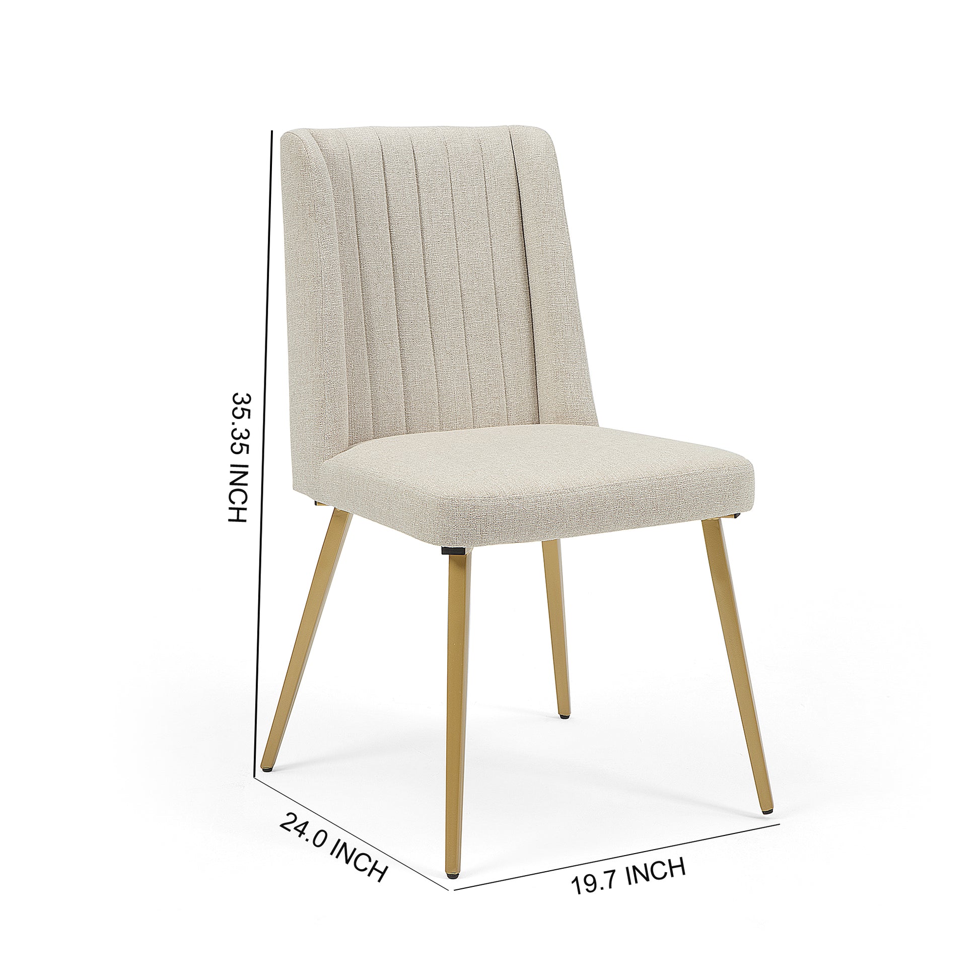 Enhance your dining space with our Beige Fabric Dining Chair set. Featuring luxurious beige fabric upholstery and a chic gold base, these chairs blend comfort and style. The padded foam seat ensures a plush seating experience, while the durable MDF and metal construction provide long-lasting stability. Perfect for both contemporary and traditional interiors, this set of two chairs offers versatile seating for any dining room.
