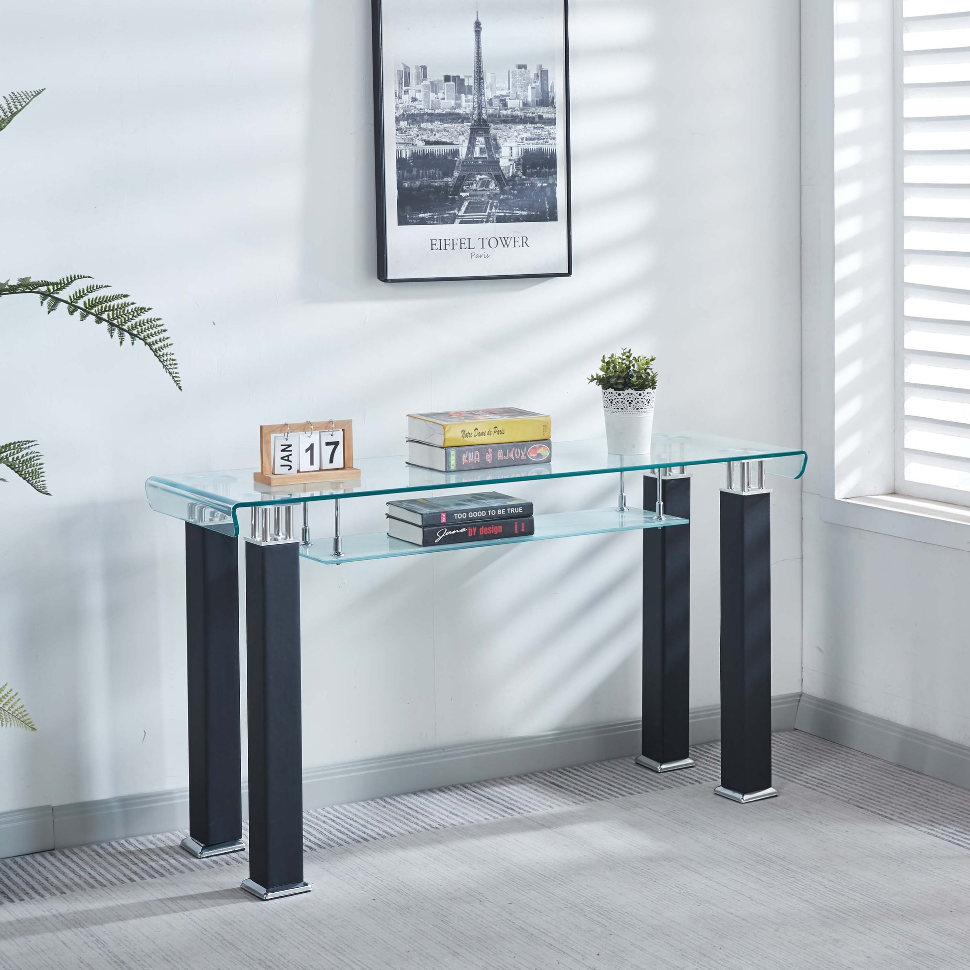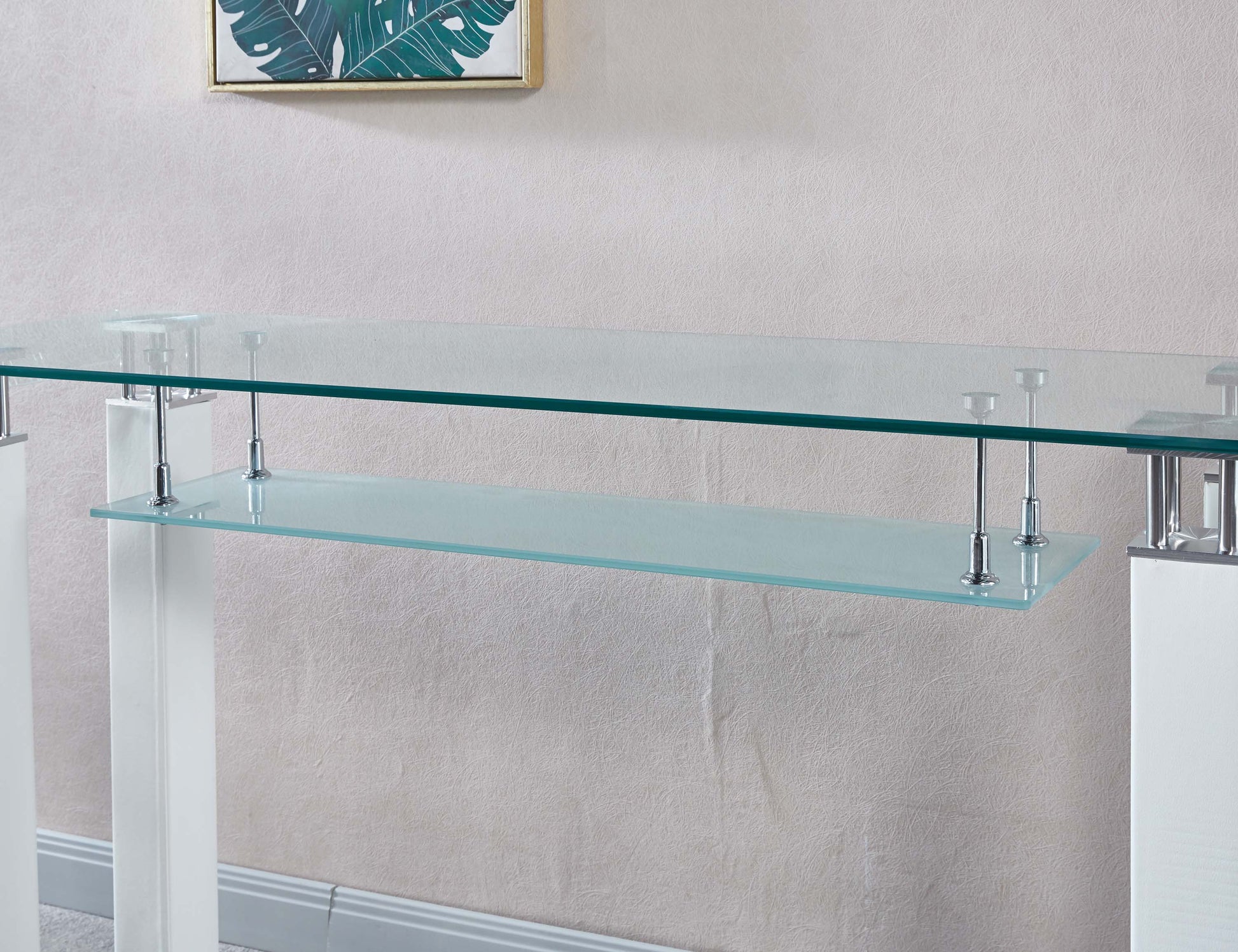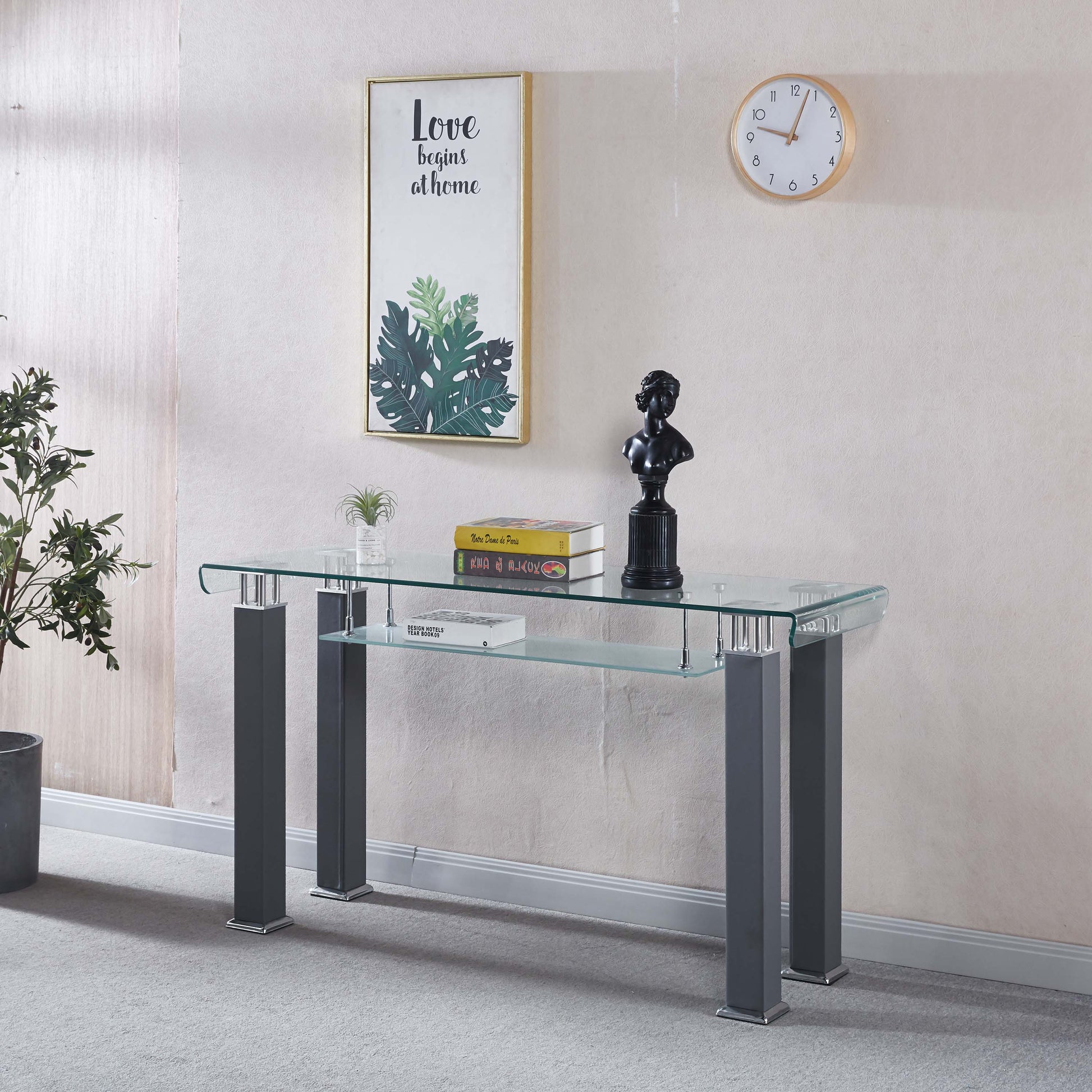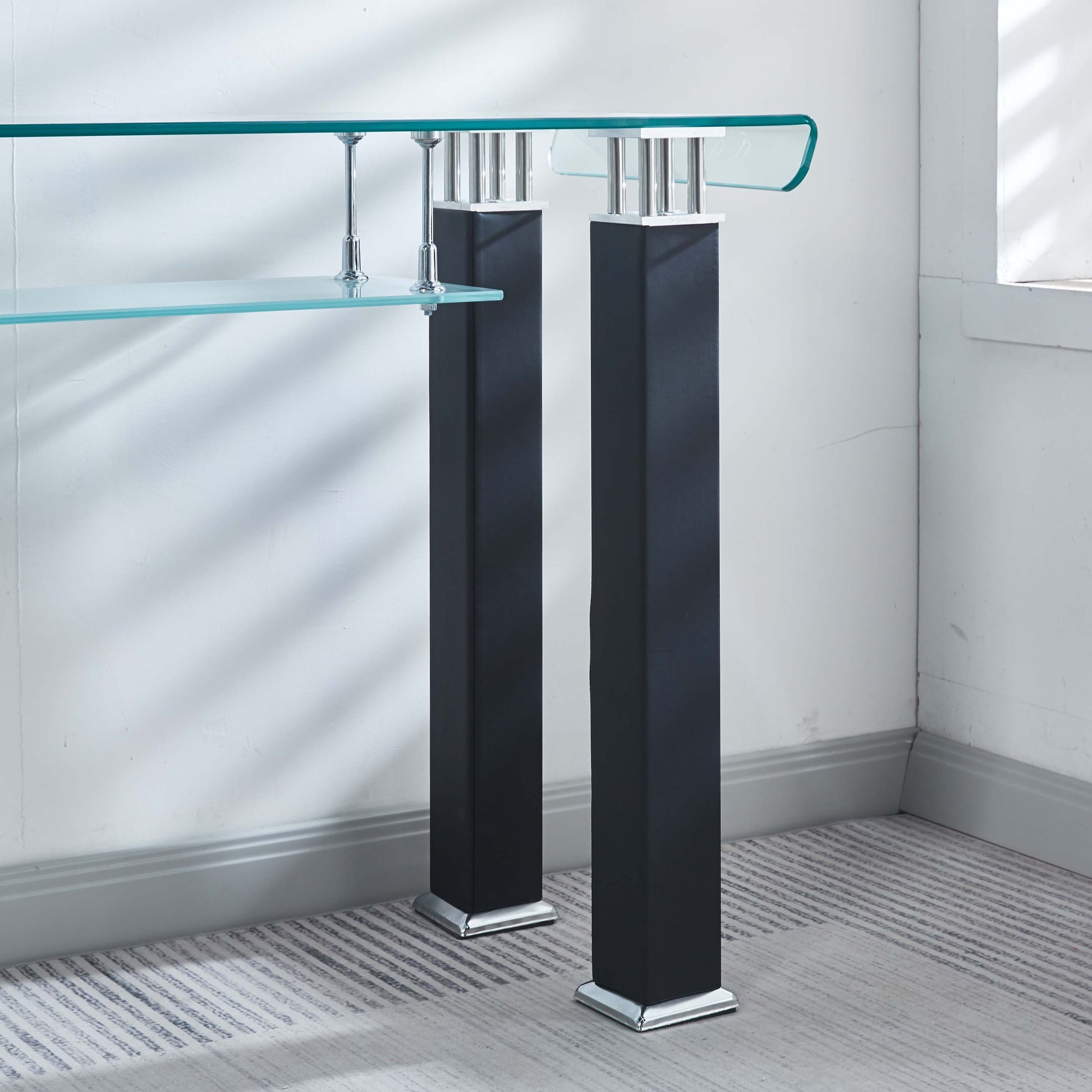 Elevate your entryway or living space with this sleek and sophisticated console table. Featuring a durable 10mm tempered glass top and an 8mm inner glass layer, this table blends elegance with functionality. The sturdy metal frame provides strong support, while the leatherette finish in black, white, or grey adds a modern touch. Whether you’re using it to display décor, store essentials, or create a stylish focal point, this console table is designed to complement any interior. With its spacious surface and slim profile, it fits easily into various spaces. Assembly is required to complete the setup.