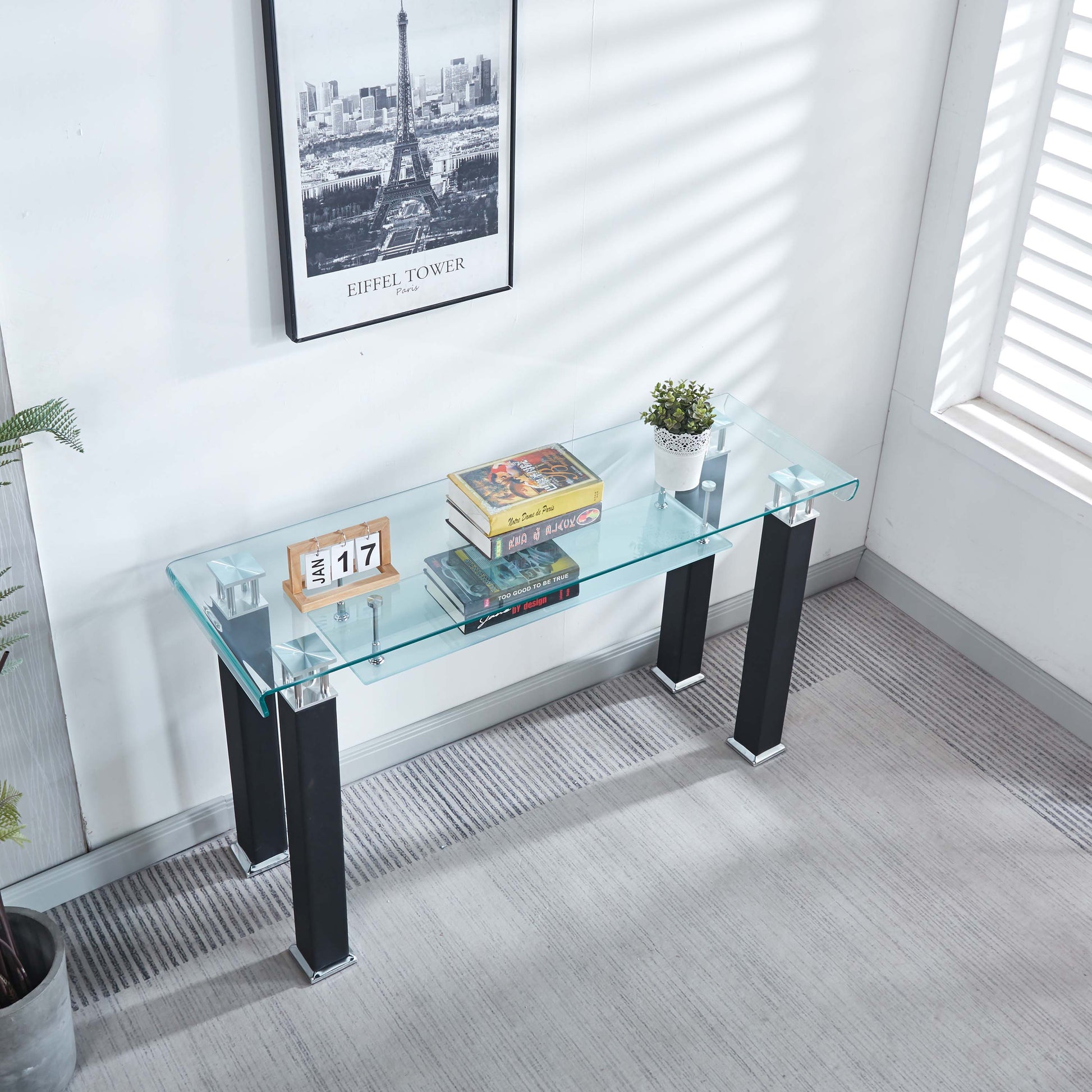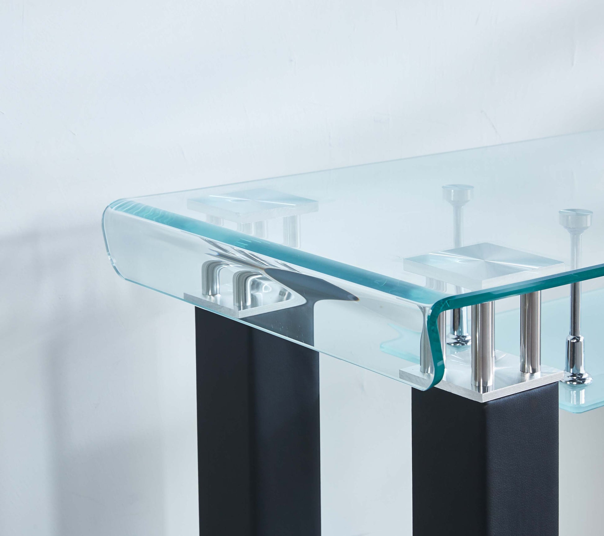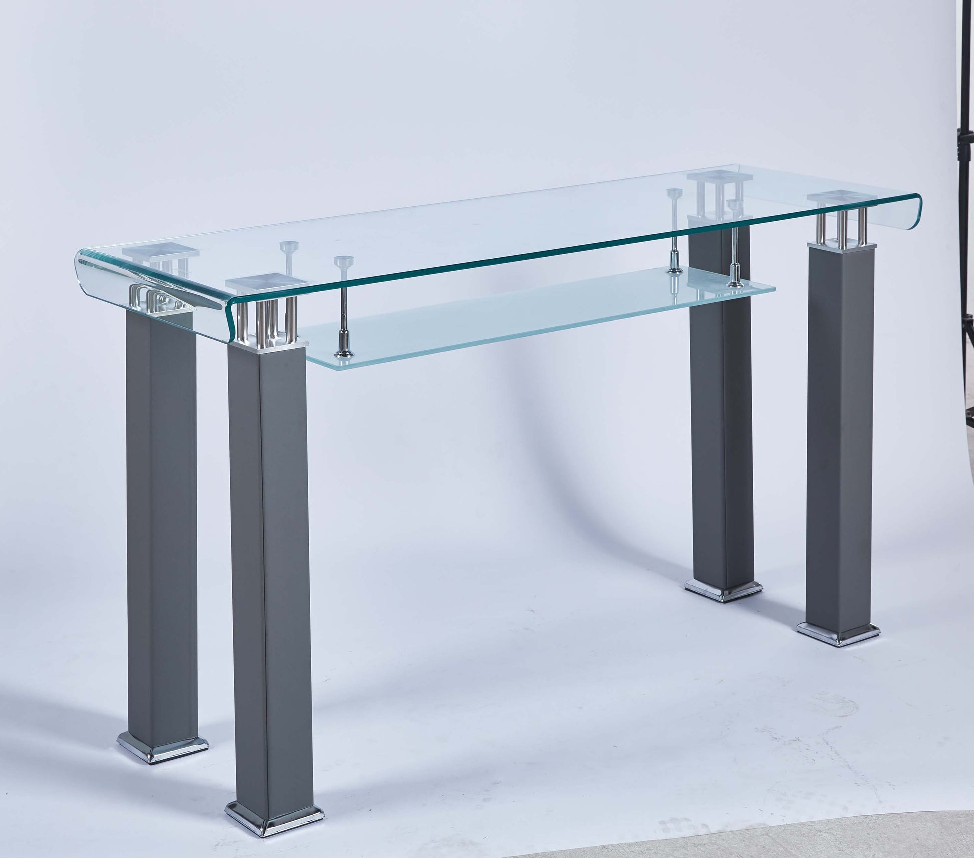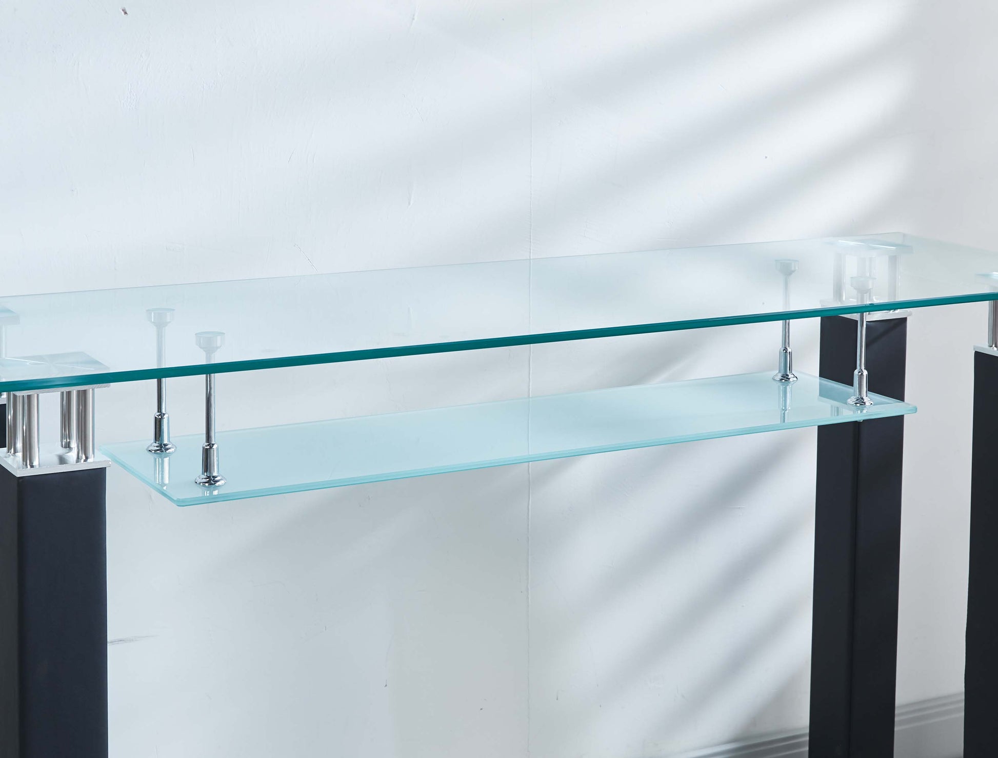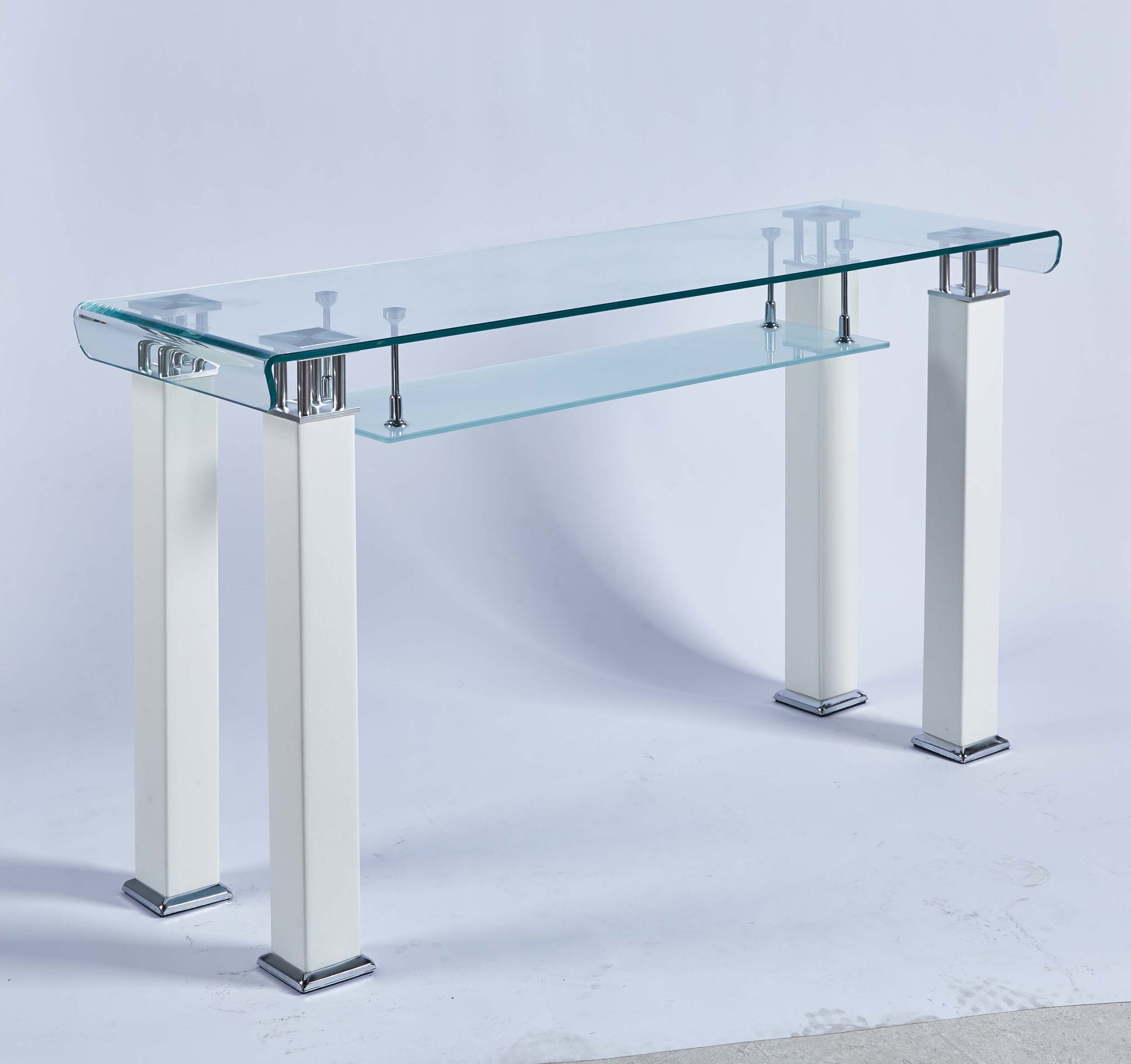 Elevate your entryway or living space with this sleek and sophisticated console table. Featuring a durable 10mm tempered glass top and an 8mm inner glass layer, this table blends elegance with functionality. The sturdy metal frame provides strong support, while the leatherette finish in black, white, or grey adds a modern touch. Whether you’re using it to display décor, store essentials, or create a stylish focal point, this console table is designed to complement any interior. With its spacious surface and slim profile, it fits easily into various spaces. Assembly is required to complete the setup.