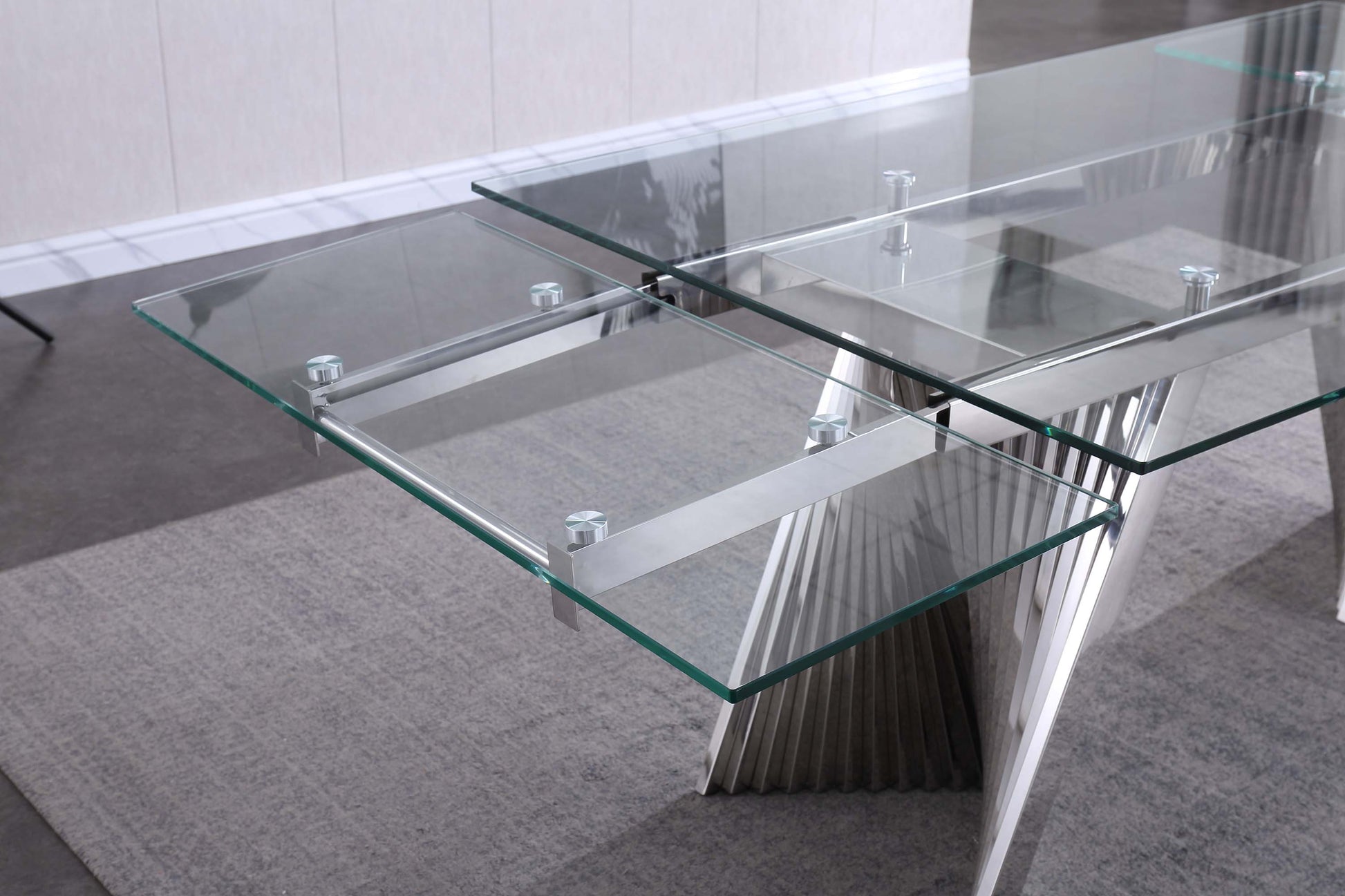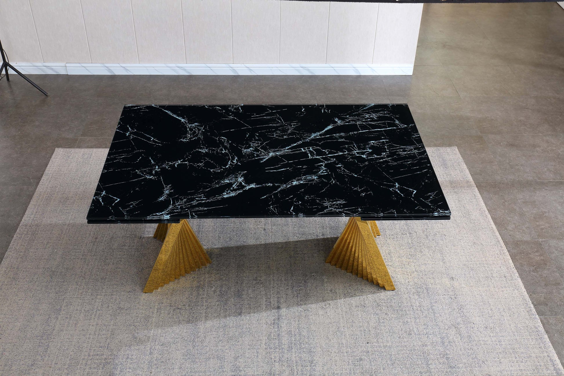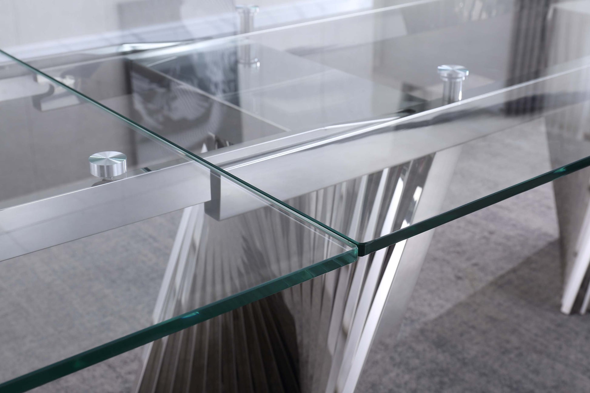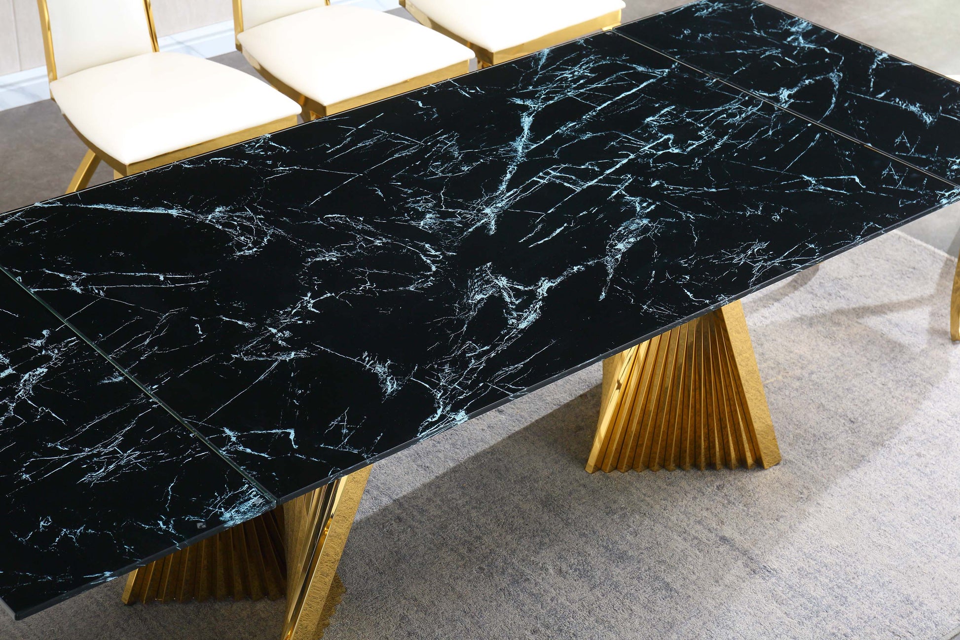 Elevate your dining experience with this luxurious extendable dining table, designed to combine style and functionality. Featuring a stunning 12mm clear tempered glass top or a striking printed black marble tempered glass top, this table makes a bold statement in any dining room. The sturdy stainless steel base, available in an elegant gold or sleek silver mirrored finish, ensures both durability and modern appeal. Perfect for hosting gatherings, the table easily extends from 63 inches to an impressive 94.5 inches in length, accommodating all your guests with ease. With its refined design and high-quality materials, this extendable dining table brings a touch of sophistication to your home.